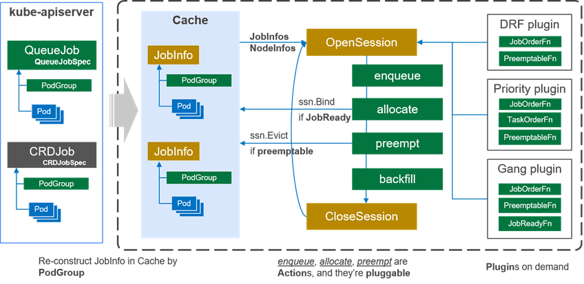 - 在每个调度周期中,会按顺序执行 OpenSession, 配置的多个动作(action)和CloseSession。在 OpenSession中用户可以注册自定义的插件,例如gang、 drf,这些插件为action提供了相应算法;多个action根据配置顺序执行,调用注册的插件进行调度;最后,CloseSession负责清理中间数据。