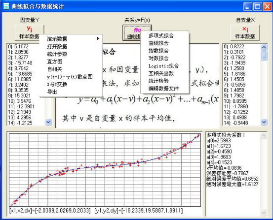 基于自变量X和因变量Y的样本数据,通过曲线拟合方法建立因变量Y和自变量X的关系: y=F(x)。包括直线拟合、多项式曲线拟合、指数函数拟合、对数函数拟合、幂函数拟合、Logistic函数拟合。曲线拟合软件还附件有统计参数计算、统计检验、一元n次方程求根、互相关函数估计、自相关函数估计、直方图和散点图等功能。