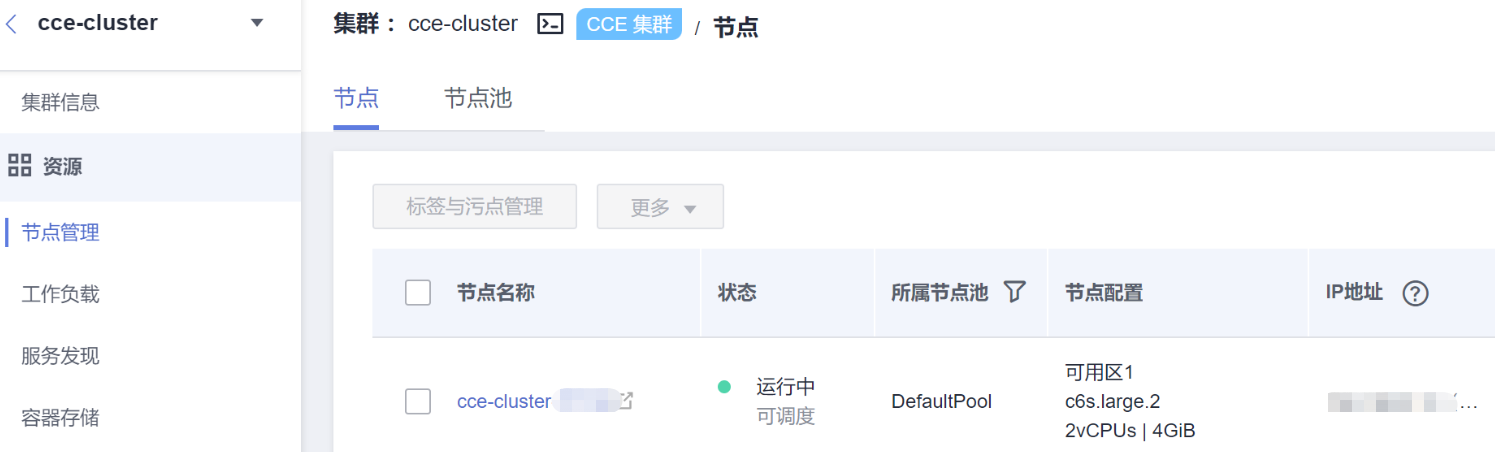 您需要创建一个至少包含一个节点的集群,且该节点已绑定弹性公网IP,集群是运行工作负载的逻辑分组,包含一组云服务器资源,每台云服务器即集群中的一个节点。