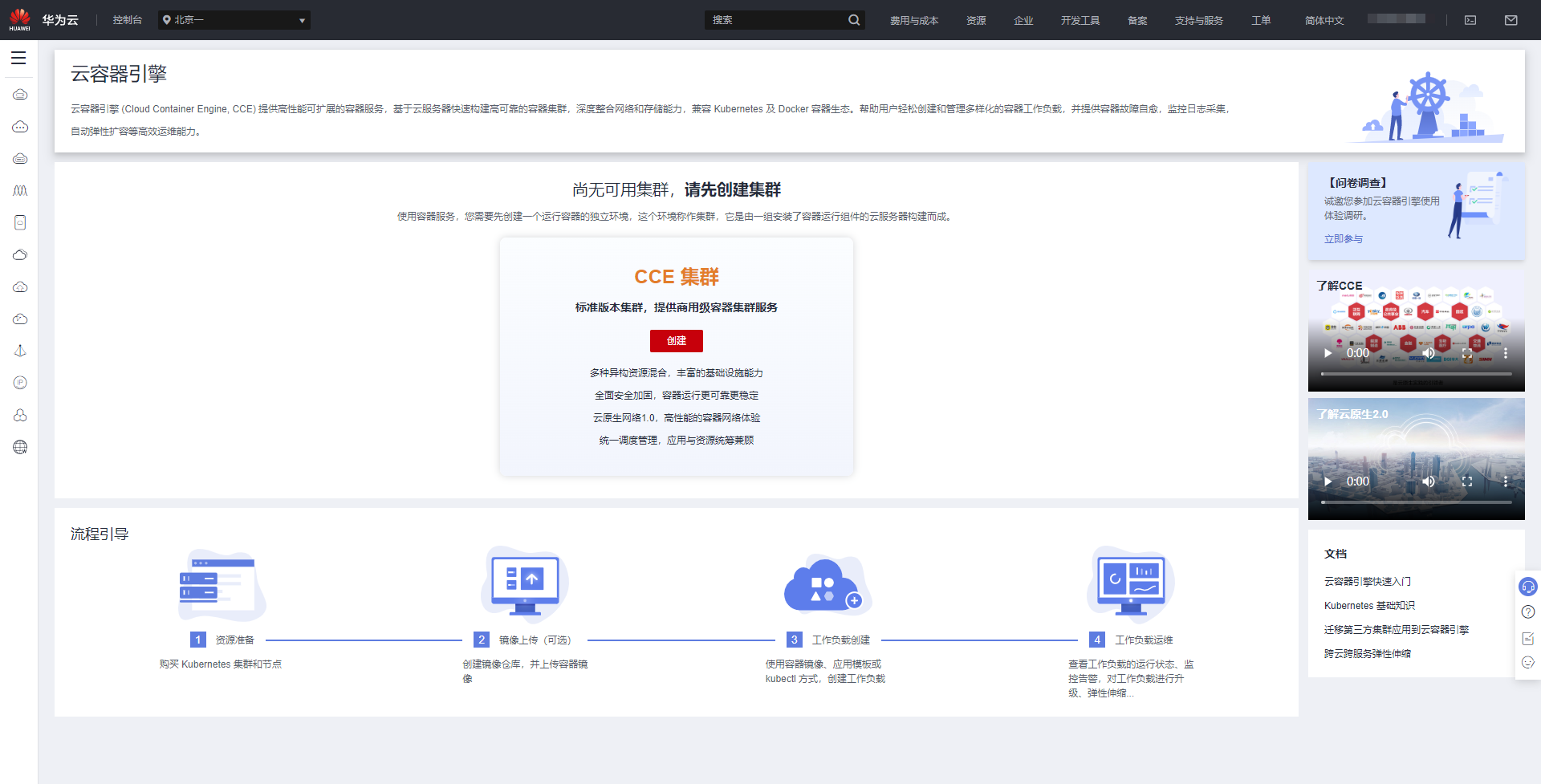 登录CCE控制台后会看见一个引导页面,请在CCE集群下单击“创建”按钮。