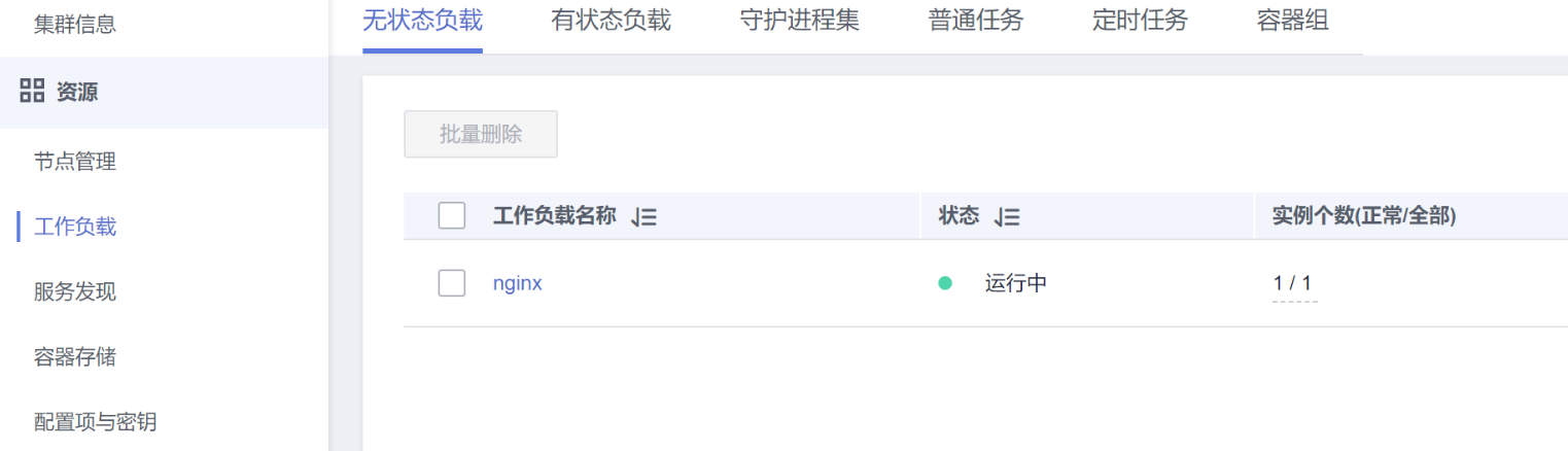 单击右下角“创建工作负载”,等待工作负载创建成功。创建成功后在无状态负载下会显示一个运行中的工作负载。
