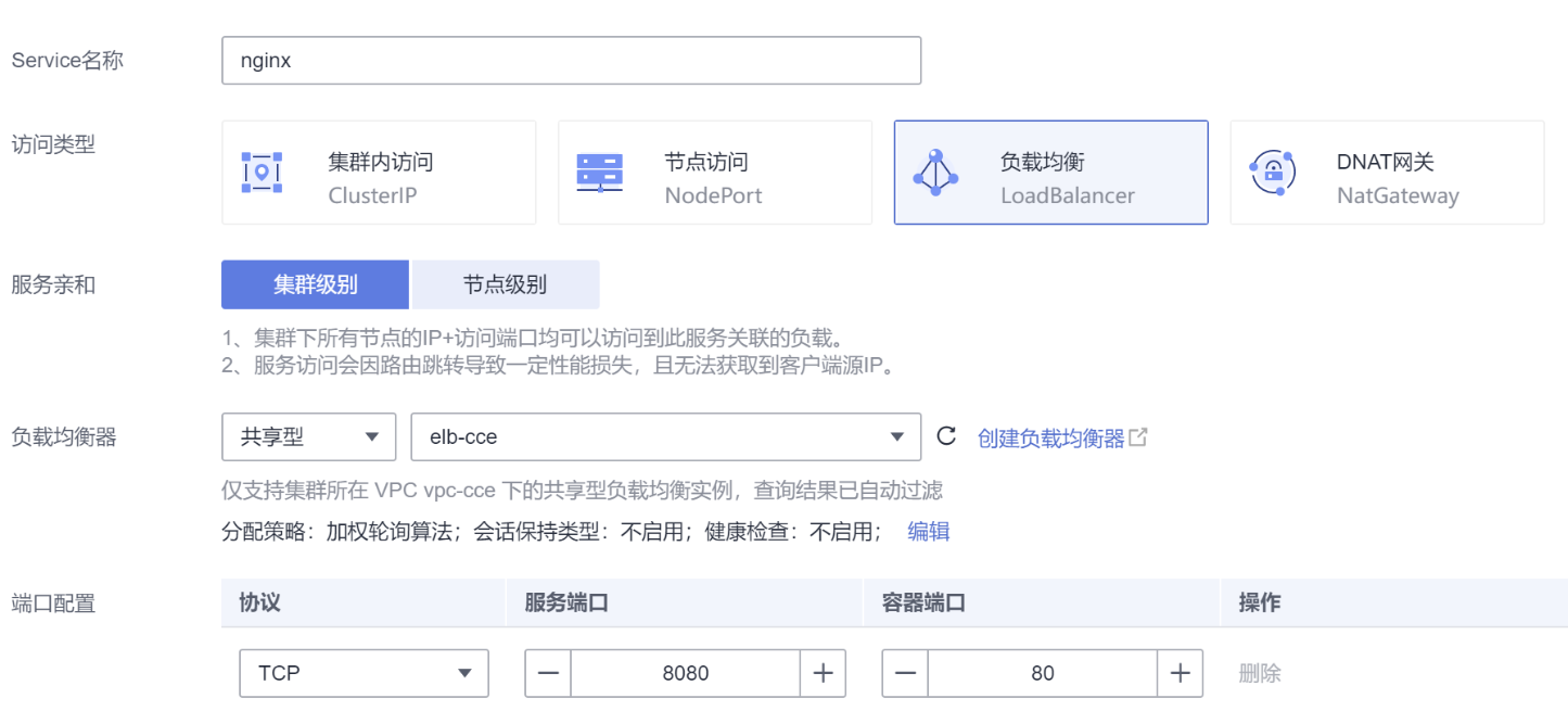 | Service名称 | 输入应用发布的可被外部访问的名称,设置为:nginx。 |