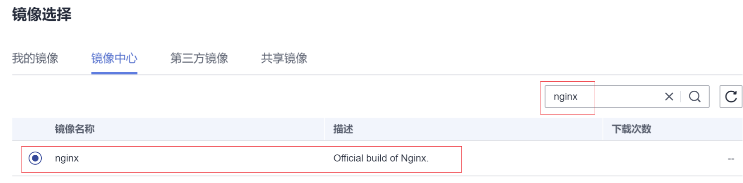 | 容器配置 | 在基本信息中单击“选择镜像”,在弹出的窗口中选择“镜像中心”,并搜索“nginx”,选择nginx镜像。 |