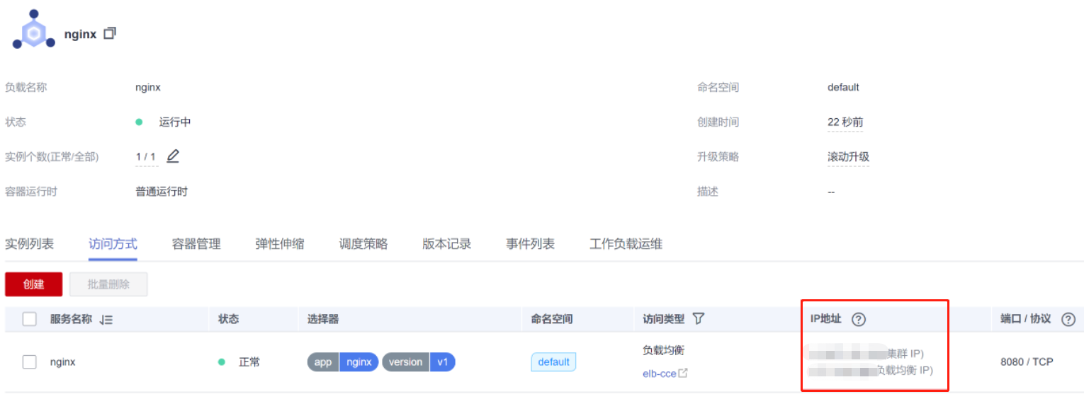 单击Nginx工作负载名称,进入工作负载详情页。在访问方式页签下可以看到nginx的IP地址,其中负载均衡IP就是外部访问地址,如图所示: