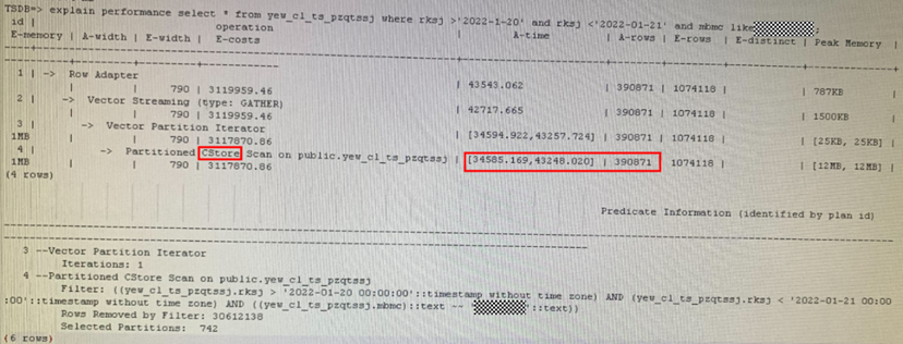 例如某业务表进场使用createtime时间列作为过滤条件获取特定时间数据,对该表设计为分区表后没有走分区剪枝(Selected Partitions数量多),Scan花了701785ms,IO效率极低。