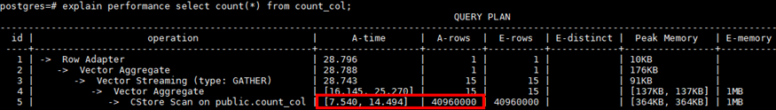 对比相同数据量的列存表(A-rows均为40960000),列存的Scan只花费14ms,IO占用极低