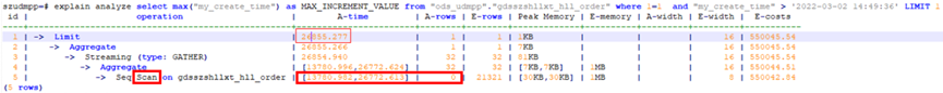 例如求某行存表某列的max值,花费了26772ms,此类作业并发起来后,整体系统IO持续100%,触发IO瓶颈,导致整体性能慢。
