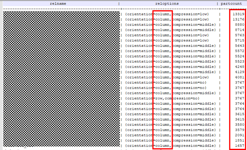 SELECT relname,reloptions,partcount FROM pg_class c INNER JOIN (