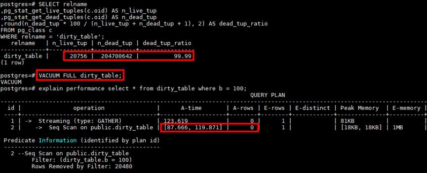 查看表脏页率为99%,Vacuum Full后性能优化到100ms左右
