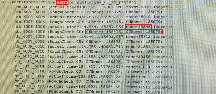 Cstore Scan的详细信息中,每个DN扫描出2w左右的数据,但是扫描了有数据的CU(CUSome) 155079个,没有数据的CU(CUNone) 156375个,说明当前小CU、未命中数据的CU极多,也即CU膨胀严重。