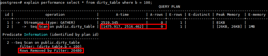 某SQL总执行时间2.519s,其中Scan占了2.516s,同时该表的扫描最终只扫描到0条符合条件数据,过滤了20480条数据,也即总共扫描了20480+0条数据却消耗了2s+,这种扫描时间与扫描数据量严重不符的情况,基本就是脏数据多影响扫描和IO效率。