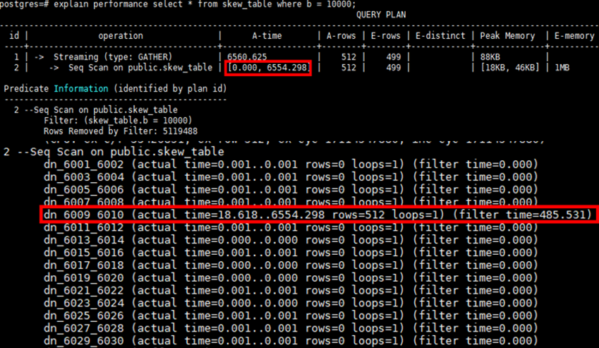 例如表Scan的A-time中,max time dn执行耗时6554ms,min time dn耗时0s,dn之间扫描差异超过10倍以上,这种集合Scan的详细信息,基本可以确定为表存储倾斜导致