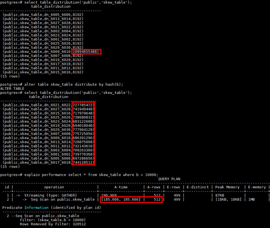 通过table_distribution发现所有数据倾斜到了dn_6009单个dn,修改分布列使的表存储分布均匀后,max dn time和min dn time基本维持在相同水平400ms左右,Scan时间从6554ms优化到431ms。