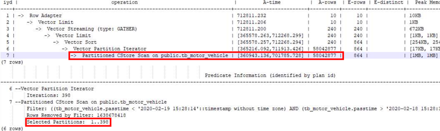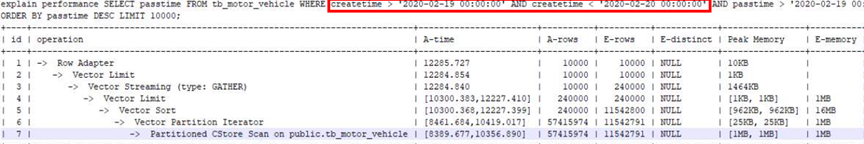 在增加分区键creattime作为过滤条件后,Partitioned scan走分区剪枝(Selected Partitions数量极少),性能从700s优化到10s,IO效率极大提升。