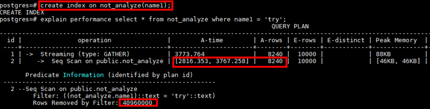 例如某点查询,Seq Scan扫描需要3767ms,因涉及从4096000条数据中获取8240条数据,符合索引扫描的场景(海量数据中寻找少量数据),在对过滤条件列增加索引后,计划依然是Seq Scan而没有走Index Scan。