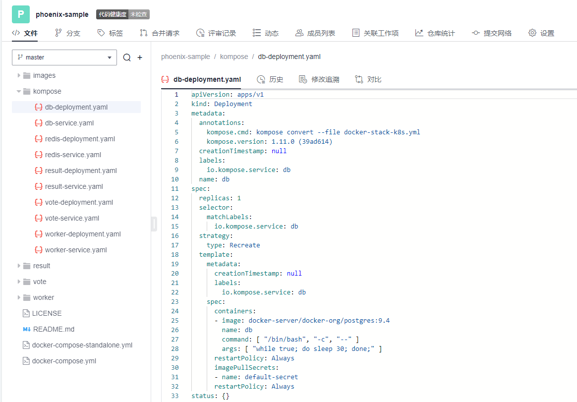 • spec:你所期望的该对象的状态。包括replicas、selector、containers等Kubernetes需要的参数。其中,containers定义了该deployment使用的镜像:docker-server/docker-org/postgres:9.4。在上篇文章中提到过,这里的docker-server、docker-org都会在构建任务中替换为实际镜像对应的镜像地址和组织。strategy、restartPolicy等字段共同构成了容器失败时重启的策略。