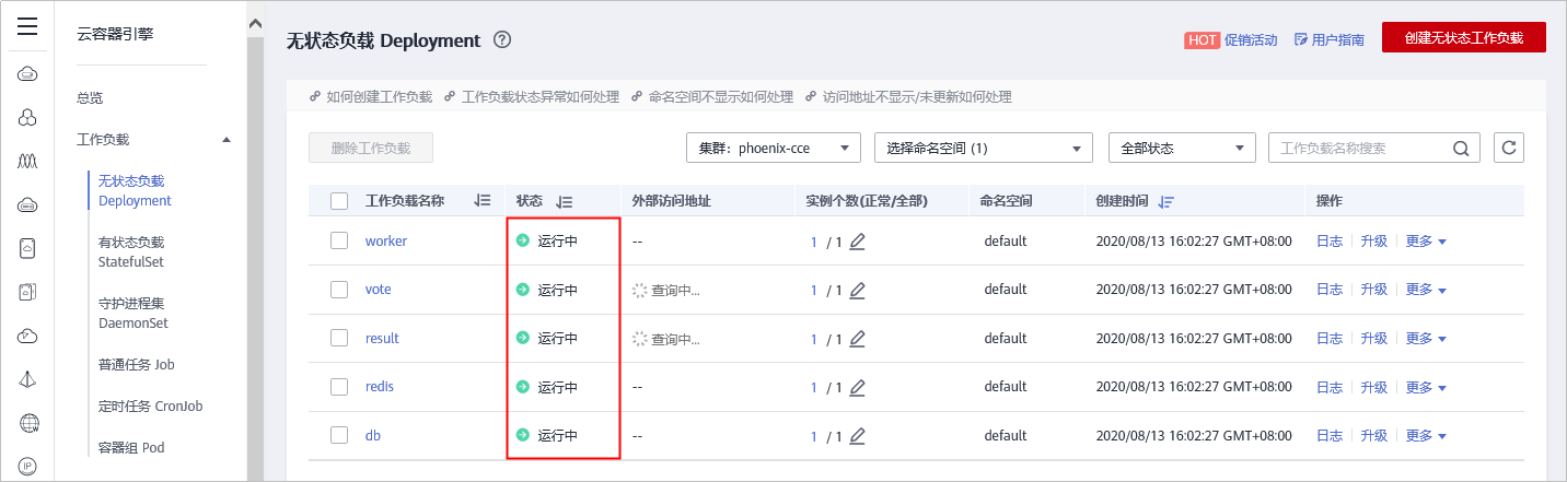 成功执行该部署任务后,可以在CCE集群中看到五个工作负载已经处于“运行中”的状态。
