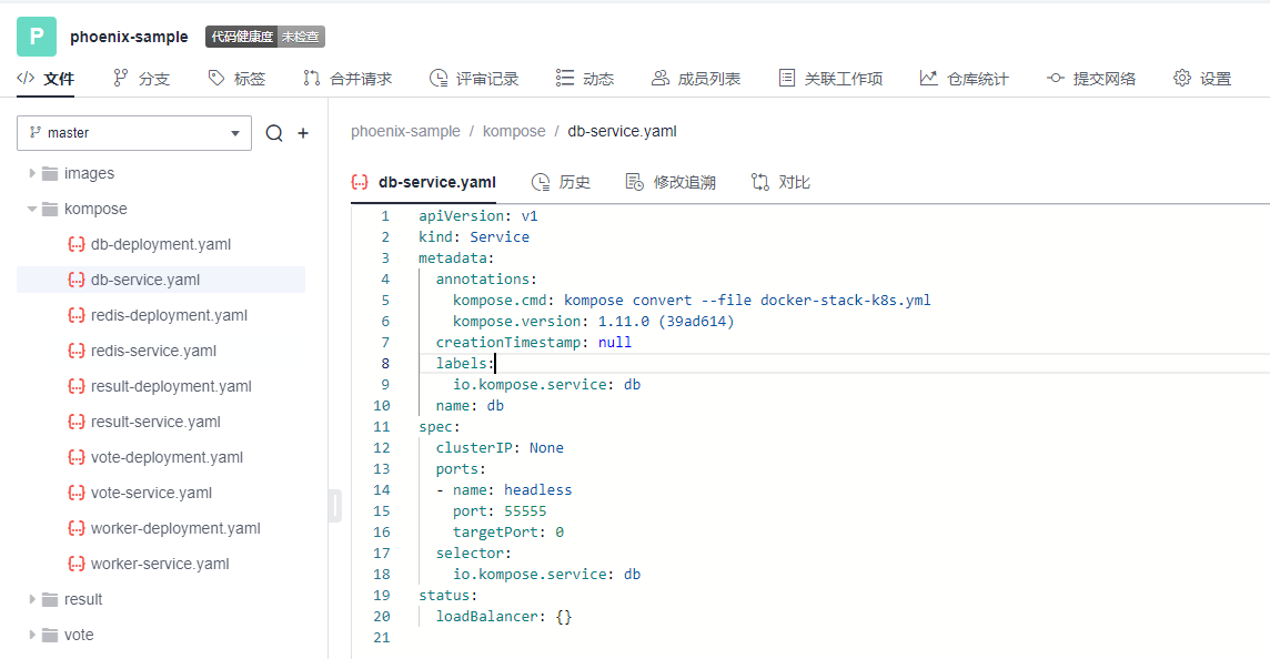 回到项目本身,代码仓库中的./kompose/文件夹下有多个yaml文件。可以看出,每个服务都有两个配置文件(*-deployment.yaml与*-service.yaml)共同进行配置。