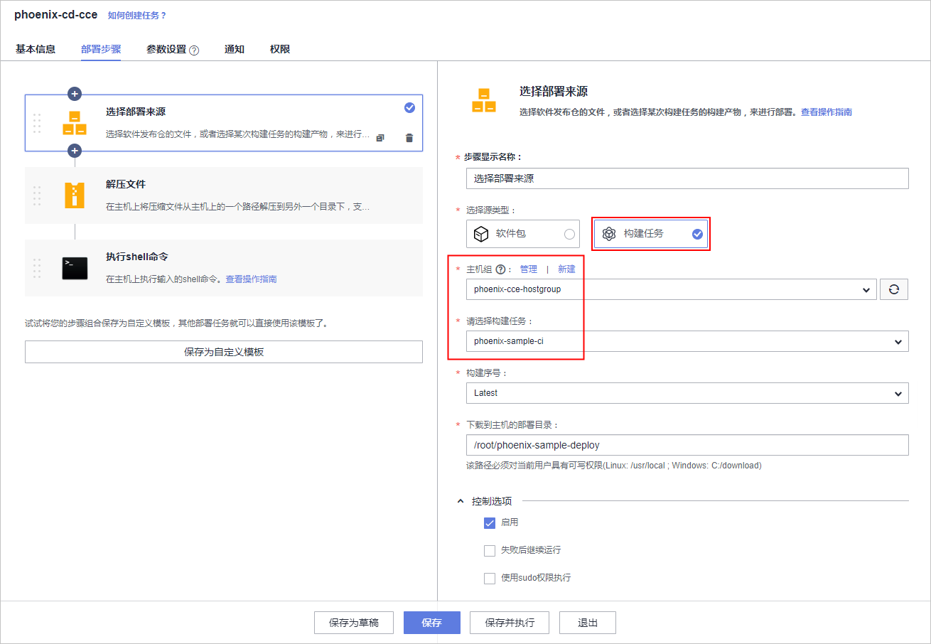 HE2E实践中,phoenix-cd-cce是我们所需执行的部署任务。该任务将配置文件传输到目标主机,即代理机、集群节点。