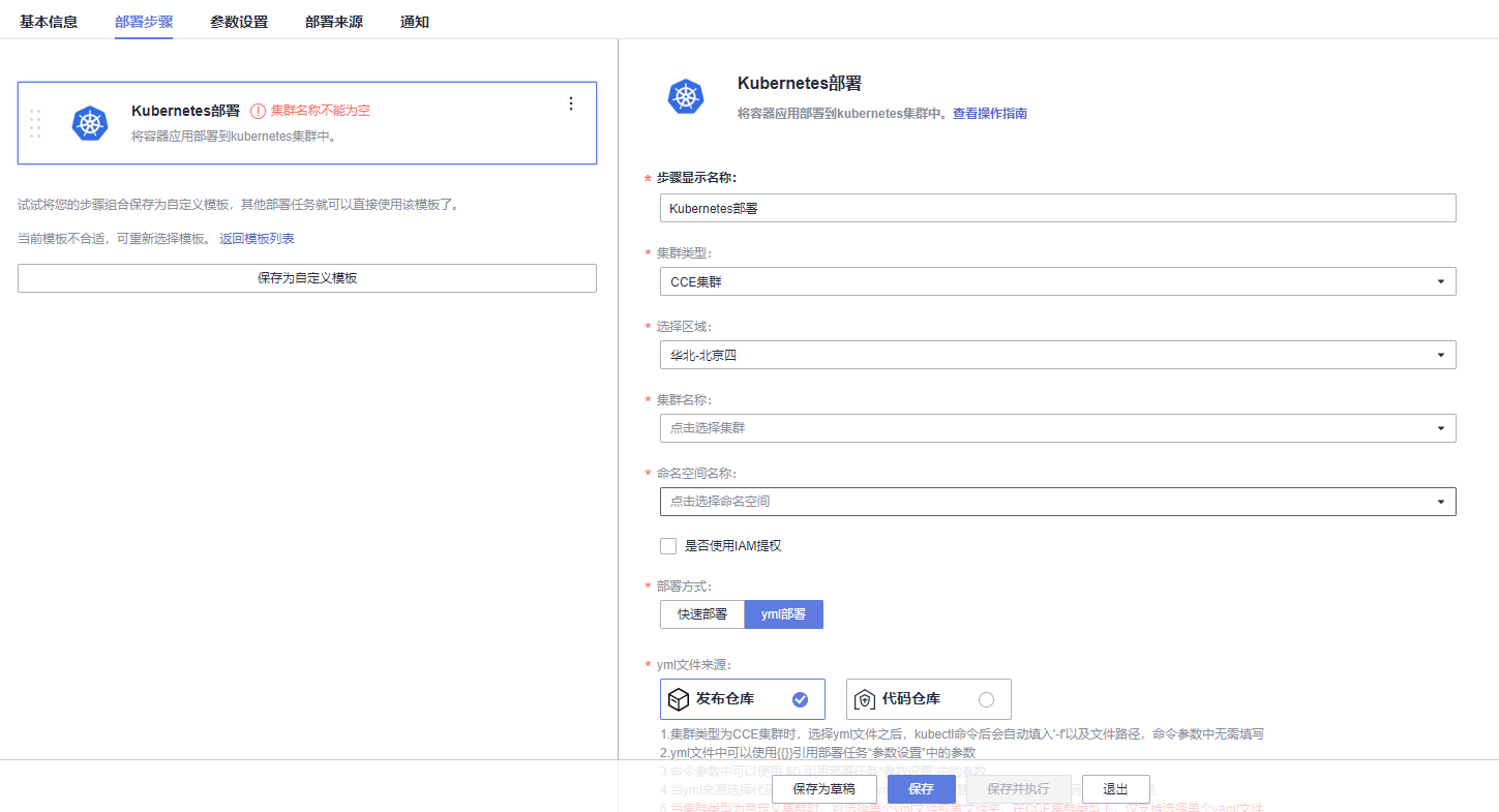 进入模板以后,可以选择集群类型、区域、命名空间、部署方式等信息。