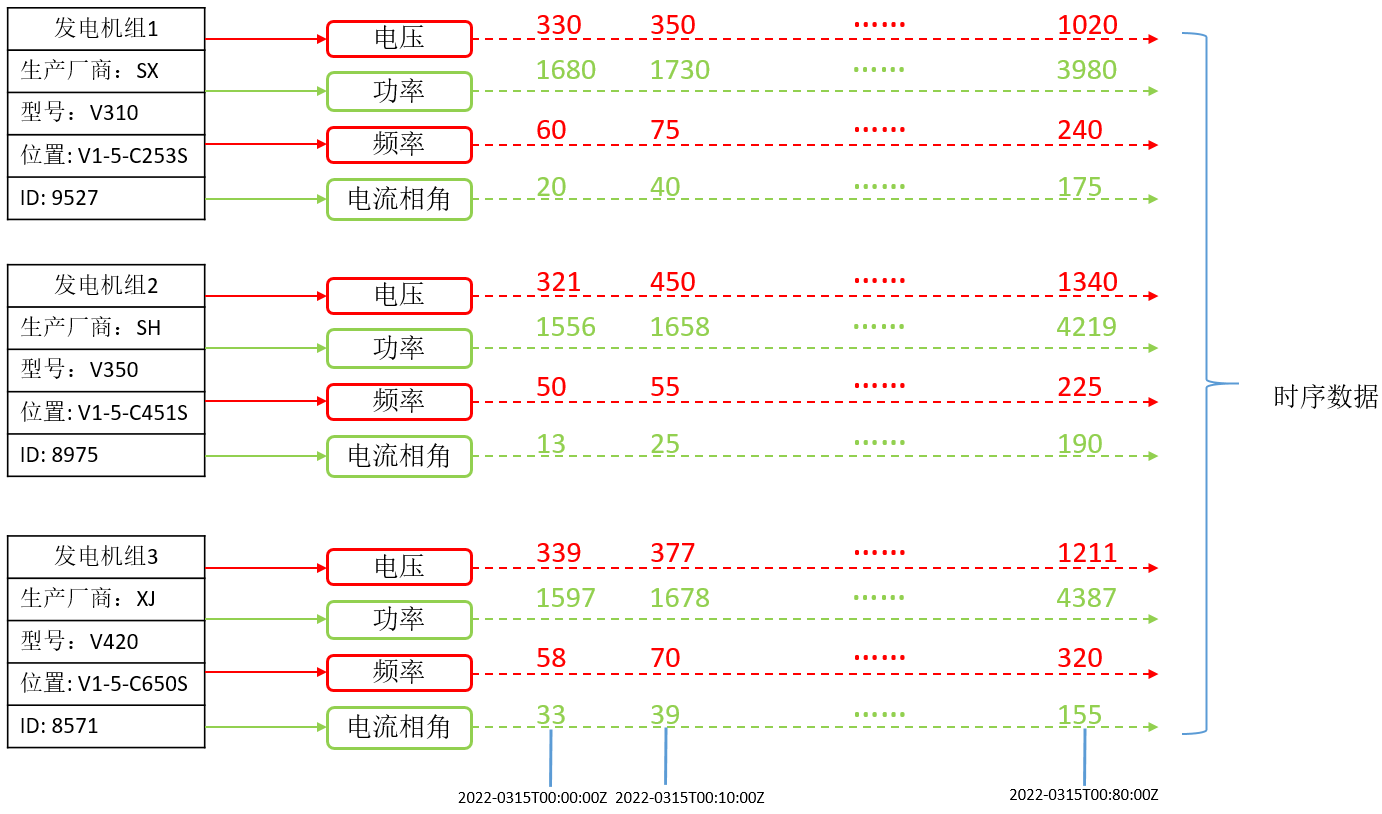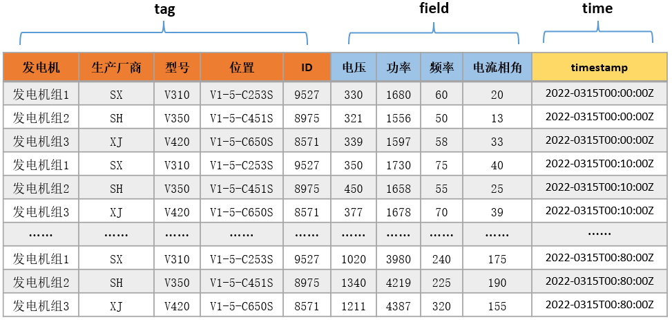 我们将示意图转化为具体的一张表中的数据存储,从上图中我们可以看到,橙色区域的列包含发电机、生产厂商、型号、位置、ID这五列,可以看到这五列表示发电机组的一些物理信息,不会随时间的变化而变化;蓝色部分的列包含电压、功率、频率、电流相角这四列,这些列是我们目标采样维度,这些列存储的采样数据会随着时间动态变化;最后一列为时间列,表示我们采样的时间点。