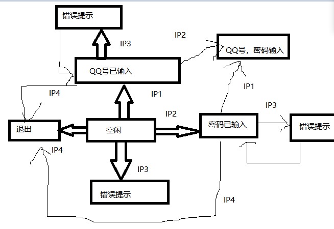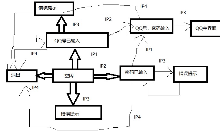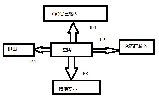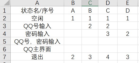 B列:从QQ登录界面,先输入QQ号(状态变为QQ已输入),在输入密码(状态变为QQ号,密码输入),点击登录,状态就变为QQ主界面