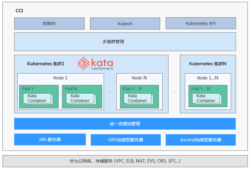 - 基于华为云底层网络和存储服务(VPC、ELB、NAT、EVS、OBS、SFS等),提供丰富的网络和存储功能。