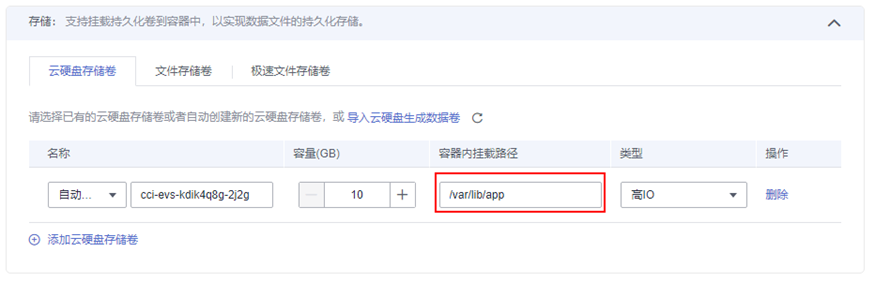云容器实例中支持将云硬盘挂载到容器中,只需在创建负载时添加云硬盘卷,并配置大小、挂载路径(也就是容器卷的路径)即可。