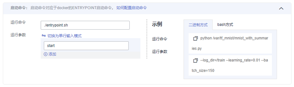 - ENTRYPOINT与CMD对应云容器实例中高级配置的启动命令,详细内容请参见容器启动命令。