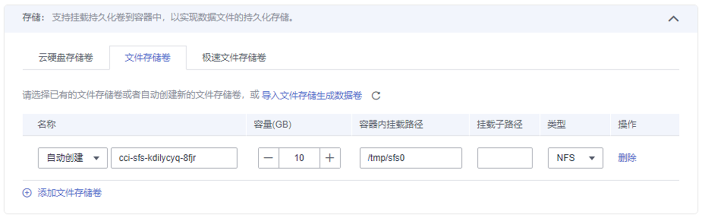 - 在容器设置下面的高级设置中,挂载一个NFS类型的文件存储卷,用于保存训练后的数据。