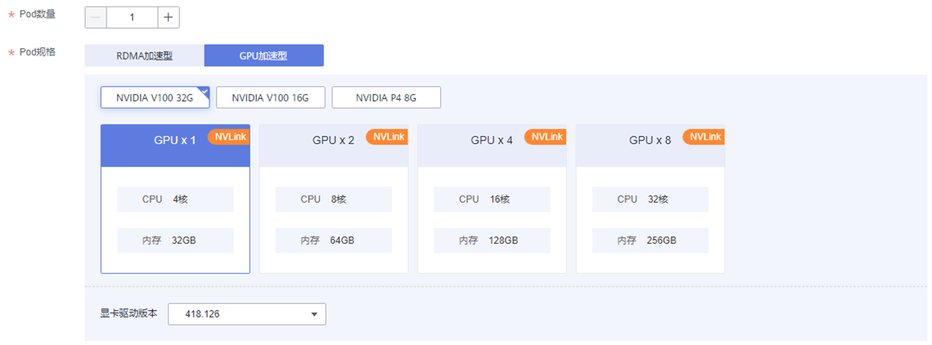 - 填写基本信息,选择2创建的命名空间,Pod数量选择为“1”,选择Pod规格为“GPU加速型”,显卡的驱动版本选择“418.126”,如下所示。