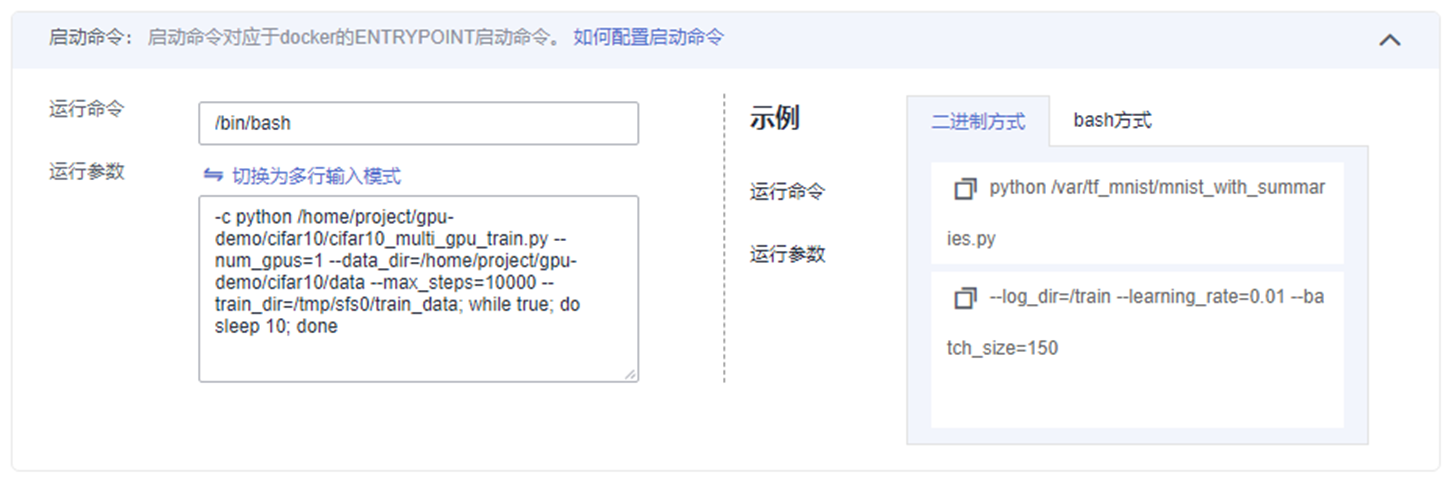 - 参数2:python /home/project/gpu-demo/cifar10/cifar10_multi_gpu_train.py --num_gpus=1 --data_dir=/home/project/gpu-demo/cifar10/data --max_steps=10000 --train_dir=/tmp/sfs0/train_data; while true; do sleep 10; done