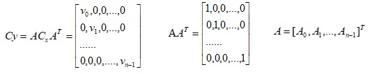 式中E{·}代表求均值运算,U=E{X}是向量X的均值向量。协方差矩阵是实对称的,体现了向量X的各分量之间的相关性,若X的各分量互不相关,那么协方差矩阵Cx中除对角线以外的元素皆为零。K-L变换的思想就是寻求正交变换矩阵A,使得A对X的变换Y的协方差矩阵Cy为对角矩阵,Y=AX。