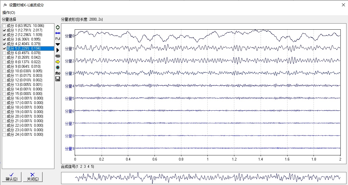 输入自相关函数估计延迟点数n之后,用当前通道当前段信号(显示信号段)估计自相关函数,构建协方差矩阵,计算特征向量。选择n各分量中的一些组合经过叠加生成新的合成信号。如下图所示。在左边的列表框中选择参与叠加的分量,打勾为参与分量。在选定好叠加分量之后,通过菜单操作:《操作》→ 《合成信号》,在窗口底部的波形为合成后波形,如图所示是1,2,3,4,5分量合成的结果。