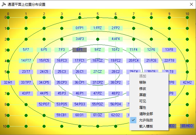屏蔽无效通道:如果某些通道信号收到干扰干扰,可以将该通道屏蔽,菜单操作:《资料》→ 《通道位置》,出现如下会话框,在通道上点击鼠标右键弹出菜单,可将该通道屏蔽,以便消除该通道对滤波结果的影响。