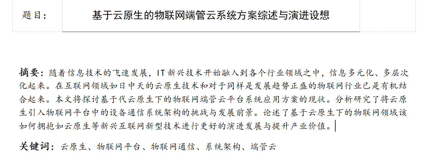 文章写的是基于云原生的物联网端管云系统的方案综述,云原生在最近是很火的技术热点,我对这个关注也很久了,十分的感兴趣,于是结合物联网系统方案进行了论文的描写。大致截图如下。截图后面是正文部分。转载请说明来处!谢谢。