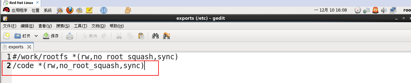 | [root@wbyq /]# mkdir /code //在根目录下创建一个code目录 [root@wbyq /]# gedit /etc/exports //打开NFS服务器配置文件 |