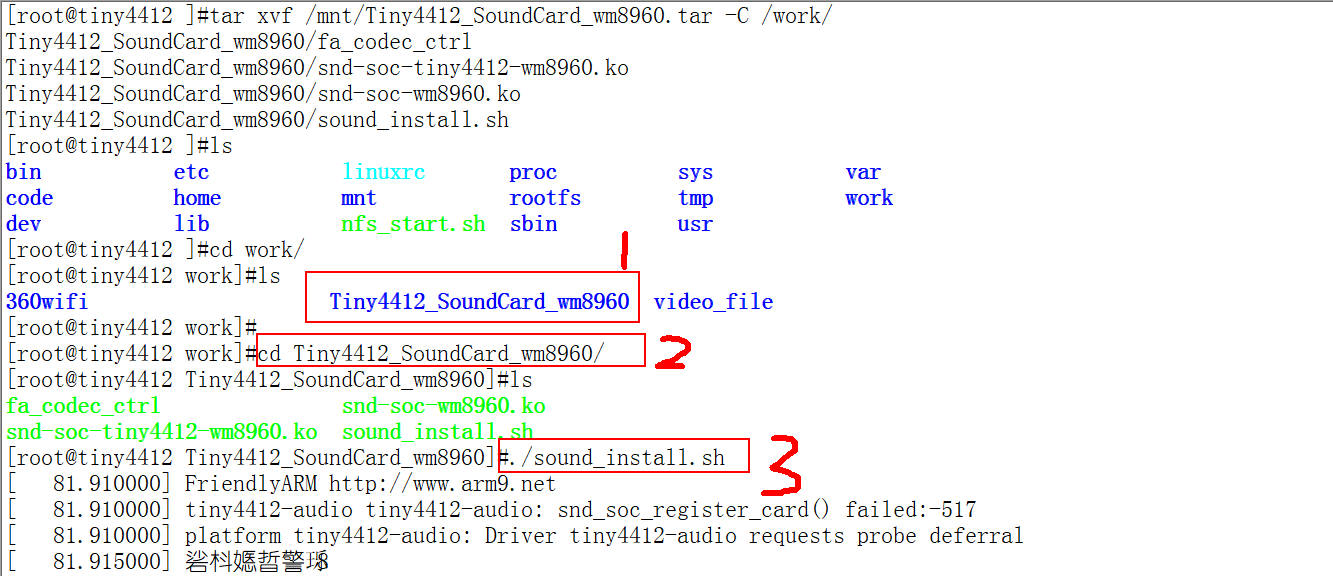 在开发板上解压: [root@tiny4412 ]#tar xvf /mnt/Tiny4412_SoundCard_wm8960.tar -C /work/