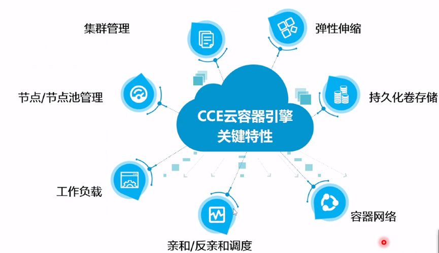 CCE云容器引擎关键特性包括集群管理、弹性伸缩、持久化卷存储、容器网络、亲和/反亲和调度、工作负载、节点/节点池管理。