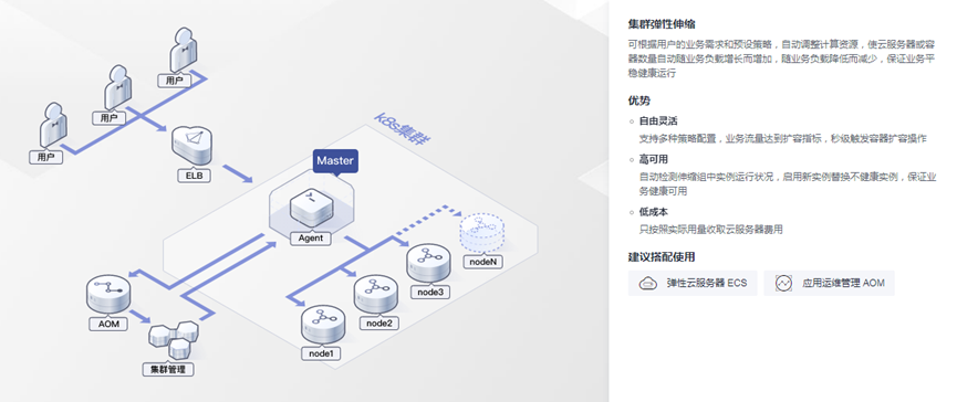 CCE支持集群节点、工作负载的弹性伸缩,支持手动伸缩和自动弹性伸缩,并可以自由组合多种弹性策略以应对业务高峰期的突发流量浪涌。