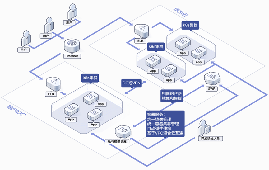 云容器引擎利用容器环境无关的特性,将私有云和公有云容器服务实现网络互通和统一管理,应用和数据可在云上云下无缝迁移,并可统一运维多个云端资源,从而实现资源的灵活使用以及业务容灾等目的。