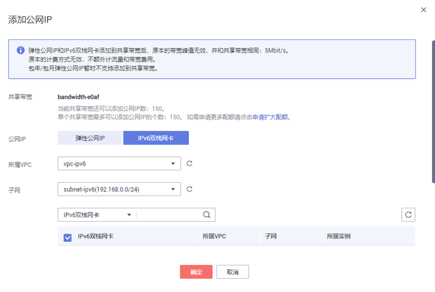 如您已有共享带宽,可以不用重新购买,直接将IPv6地址加入共享带宽即可。