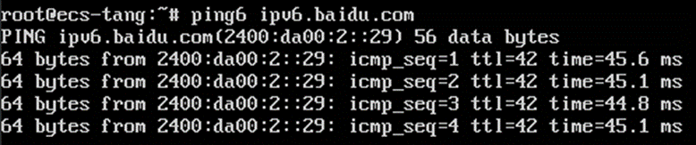 登录到ECS实例,ping一个公网上的IPv6服务,验证连通性。例如:ping6 ipv6.baidu.com,执行结果如图4所示。