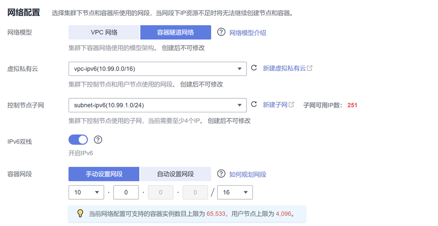 - 控制节点子网:请务必选择已开启了IPv6的子网,否则该集群创建界面中不会显示“IPv6双栈”的开关按钮。