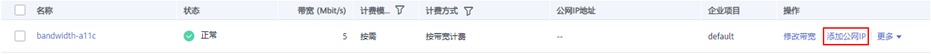 - 在共享带宽列表页,单击操作列的“添加公网IP”。