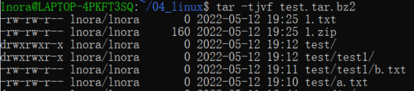 (8) 在04_ubuntu目录下,查看test.tar.bz2包中的内容。