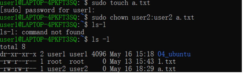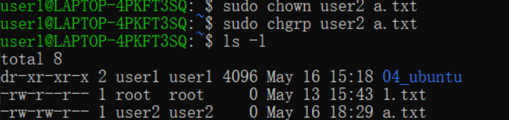 (11)以user1用户登陆,在当前用户主目录下,创建文件a.txt,使用命令将a.txt文件的所有者变更为user2,所属组也变更为user2。使用两种命令实现对文件所属组的变更。