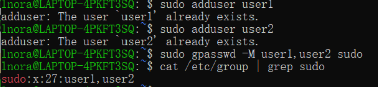 (10)创建新用户user1,user2,将两个用户加入到sudo组中,使两个用户都可以通过sudo命令提升权限。