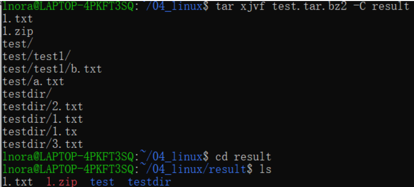 (9)在04_ubuntu目录下,新建result目录,解压包文件test.tar.bz2到result目录下。