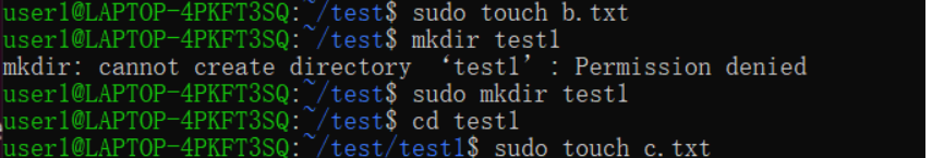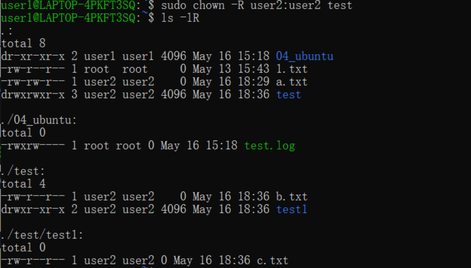以user1用户登陆,在当前用户主目录下,创建目录test,在test目录下创建文件b.txt,同时创建子目录test1,在test1目录下创建文件c.txt,然后回到user1用户主目录,使用命令将test目录下所有文件和子目录的所有者变更为user2。